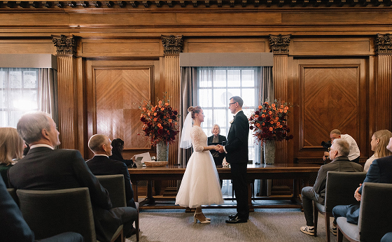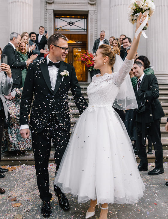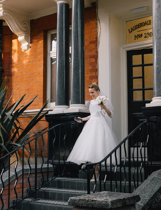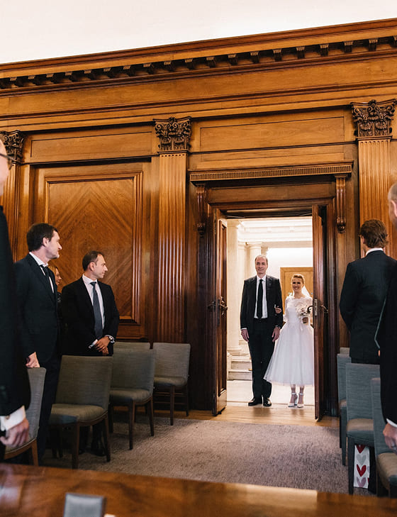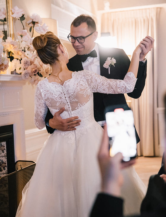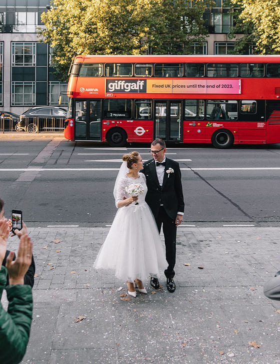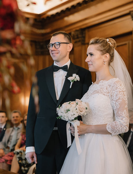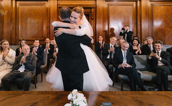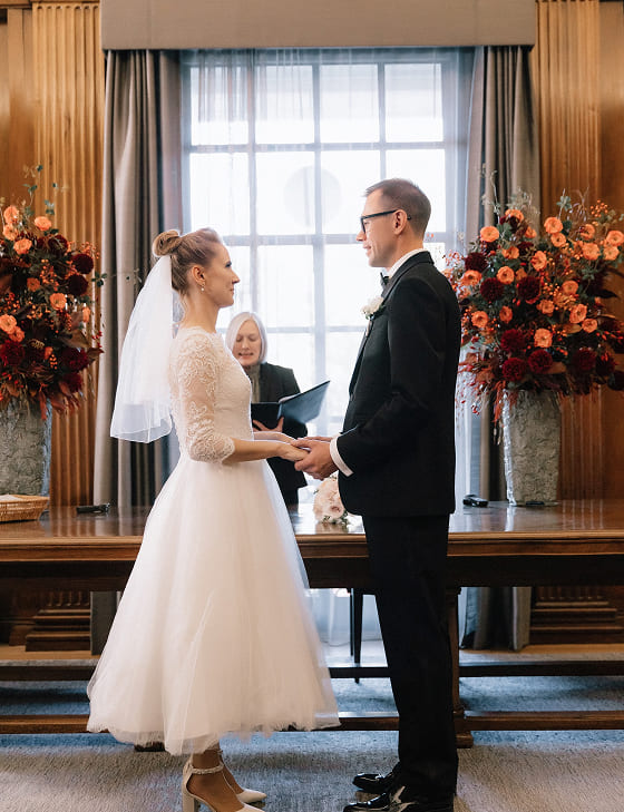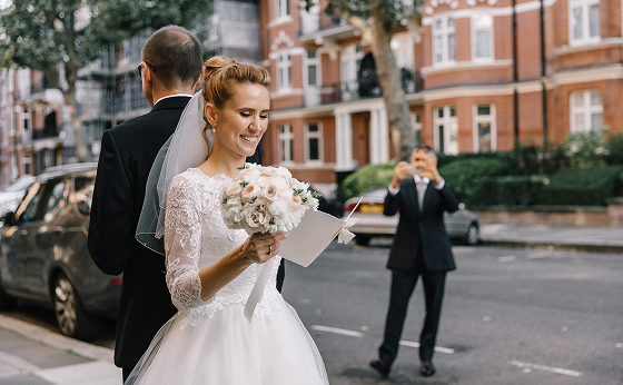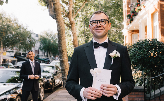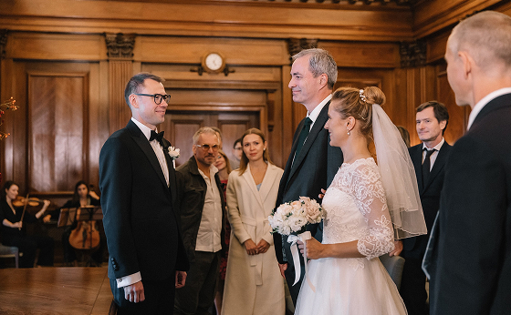 Официальная церемония прошла в Old Marylebone Town Hall в одном из самых просторных и торжественных залов Westminster. Под живой аккомпанемент скрипки и виолончели Олена и Сергей обменялись клятвами в окружении близких.