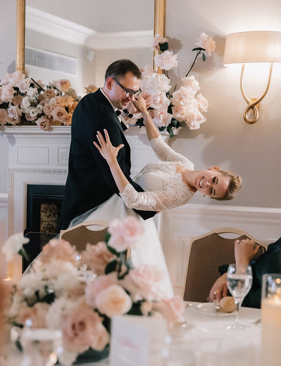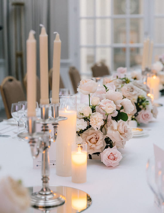 Свадебный ужин в камерном зале с камином, мягкий свет, живая флористика, свечи и продуманные детали: все это создало неповторимую атмосферу уюта и сдержанной элегантности для пары и их гостей