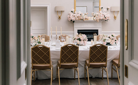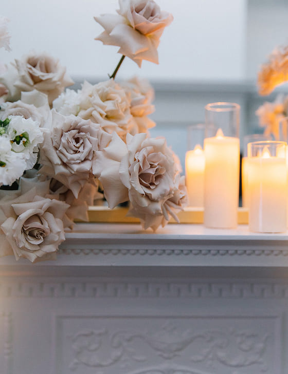 The wedding dinner took place in an intimate fireplace room, where soft lighting, natural florals, candlelight, and carefully considered details created an atmosphere of understated elegance and quiet comfort for everyone present.