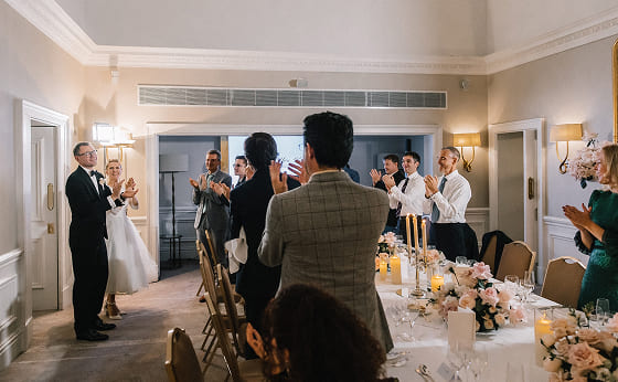 После церемонии гости вместе с парой неспешно направились к The Landmark London — путь занял всего несколько минут и стал естественным продолжением дня, плавно перетекающим в вечернюю часть праздника.