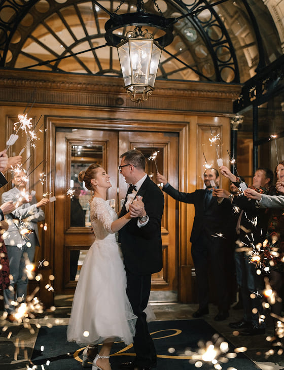 To close the day, Elena and Sergey lit sparkling fountains at the entrance of The Landmark London - a warm and meaningful way to say goodbye to such a special occasion.